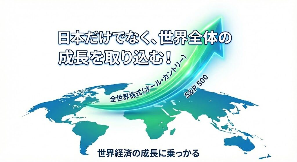 政治経済の視点で見れば、日本の成長率は停滞していますが、世界経済全体で見れば人口は増え続け、成長を続けています。 この「世界の成長」に乗っかるのが、最も堅実な投資スタイルです。