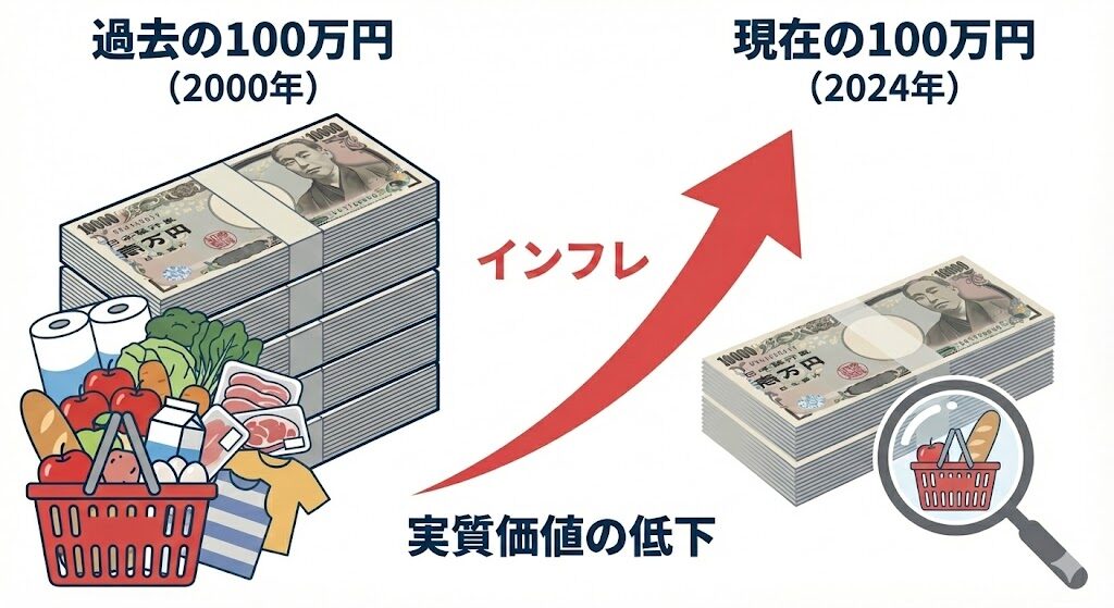 例えば、インフレ率が2%続くと、今日100万円で買えていた車が、来年には102万円になります。 銀行に預けていても金利はほぼ0%ですから、あなたの100万円は数字上は減っていなくても、「買えるモノの量(価値)」は確実に減っているのです。
