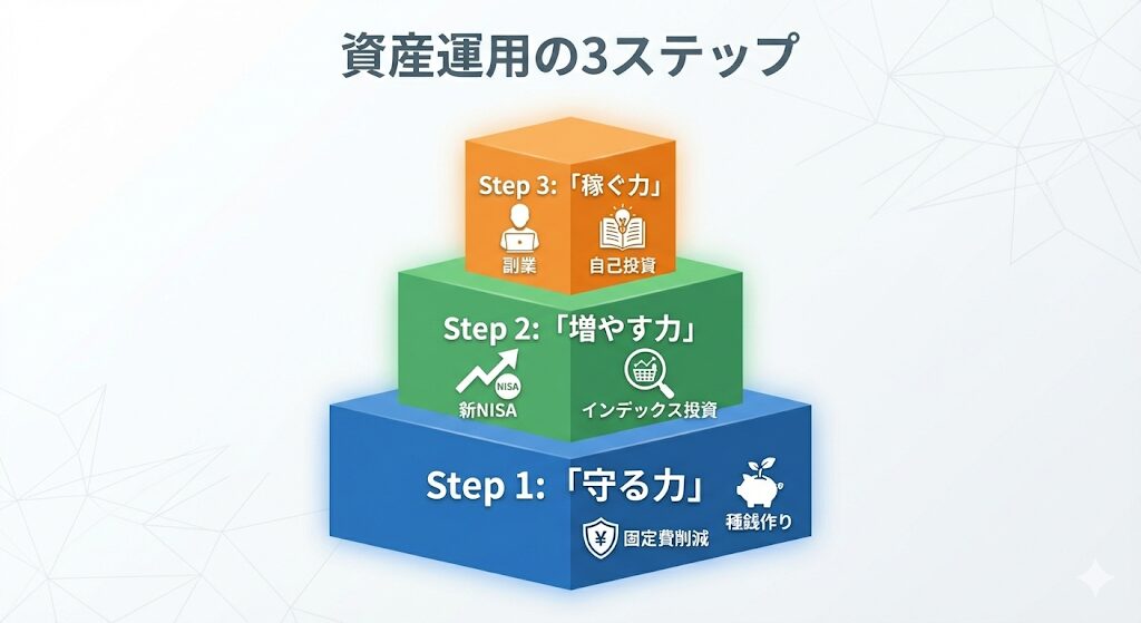 資産形成には、絶対に守るべき「順番」があります。 多くの人が、いきなり投資を始めようとして失敗します。そうではなく、「守る→増やす→稼ぐ」の順で進めるのが鉄則です。